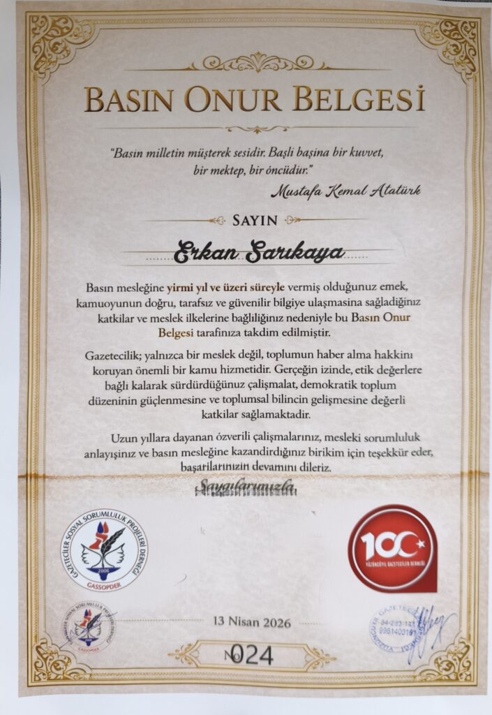 Serhat Yaşam Dergisi ve Siyasal Yaşam Gazetesi imtiyaz sahibi Erkan Sarıkaya meslekteki üstün hizmetleri ve etik değerlere bağlılığı nedeniyle “Basın Onur Belgesi”ne layık görüldü.