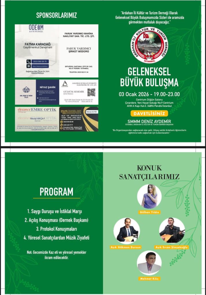 İstanbul Ardahan İli Turizm ve Kültür Derneği, geleneksel büyük dayanışma gecesi 3 Ocak 2026 Cumartesi akşamı Pendik Centrium düğün salonunda yapılacak.Gecede Kaz eti ve yöresel yiyecekler ikram edileceği öğrenildi. Gecede sahneye çıkacak sanatçılar; THM Sanatçıları Mehmet Kılıç, Gülhan Yıldız, Âşık Gökmen Dursun ve Âşık Ercan Şimşekoğlu yer alıyor.
