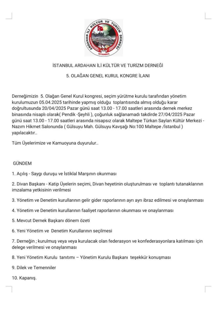 İstanbul Ardahan İli Kültür ve Turizm Derneğinin 5.Olağan Genel Kurul Kongresi 20.04.2025 tarihinde 13.00-17.00 arası nisaplı olarak dernek merkezinde, çoğunluk sağlanamadığı takdirde 27.04.2025 tarihinde 13.00 – 17.00 saatleri arasında nisapsız olarak Maltepe Türkan Saylan Kültür Merkezi Nazım Hikmet Salonunda yapılacaktır.