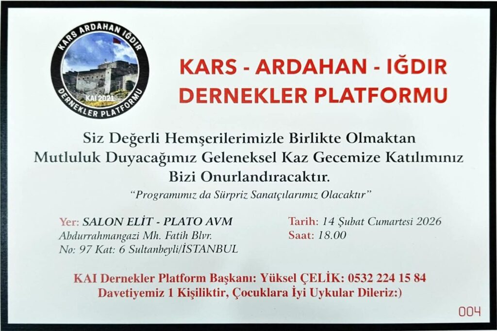 Gecede misafirlere Kaz eti ikram edilecek. Ayrıca gecede yöresel sanatçılar sahne alacağı öğrenildi. Kars Ardahan Iğdır Dernekler Platformu, 14 Şubat 2026 Cumartesi akşamı saat 18.00’de Sultanbeyli Plato AVM üst katında bulunan Elit Düğün Salonu’nda düzenlenecek Kaz gecesi programına yoğun ilgi bekleniyor.